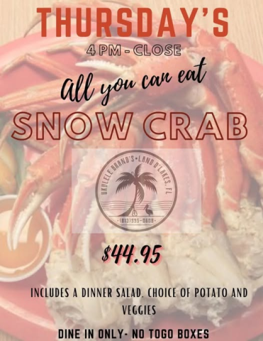 Occurs Weekly Thursday 4 - 11pm Upcoming Apr 16 2026 | 4 - 11pm Add to calendar: Google Outlook iCal All You Can Eat Snow Crab Legs $44.95 - includes dinner salad, choice of potato, and veggies.